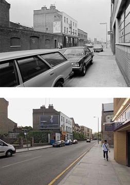 Westferry Road opposite Burrell's Wharf, looking west. The 'Robert Burns' pub later became an Islamic Centre