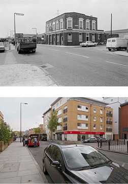 Junction of Westferry Road & Crews Street, looking south. The 'Kingsbridge Arms' pub was demolished in the 1990s