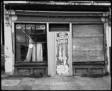 1984. Derelict cafe in a row of houses on the east side of Westferry Road opposite Gaverick Street (later Mews). The building was later refurbished and the cafe entrance replaced by a bay window