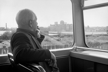 1984. An older Island resident looking at the land clearance in Millwall Docks from the top of a double decker bus going south on Westferry Road