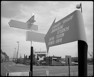 1985. LDDC signage at the western end of Canary Wharf, looking east. The Docklands Light Railway is visible under construction in the distance