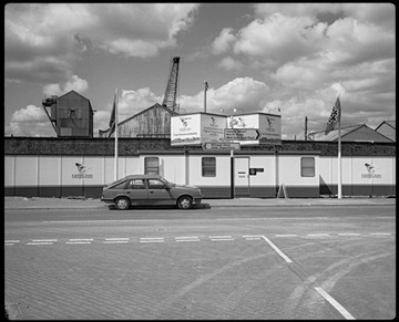 1985. Heron Quays site office at the junction of Marsh Wall and Millharbour, looking west,