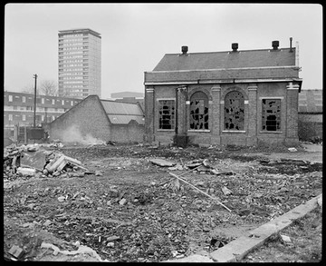 1985. Demolition of industrial buildings on the west side of West India Dock. Later, this became the site of the National Westminster Bank. One of the Barkantine Towers and Alpha Grove maisonettes are in background