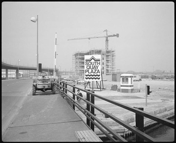 1986. Looking west along Mash Wall from the cutting between South West India Dock and Millwall Inner Dock towards the South Quay Plaza under construction (and which was later destroyed by an IRA bomb). This was built on the site of ‘Shed 19’