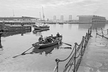 1984. Entrance lock to South West India Dock, looking west towards ‘Shed 19’. Members of the Museum in Docklands project team (including Alex Werner and David Dewing) are rowing a skiff into the dock